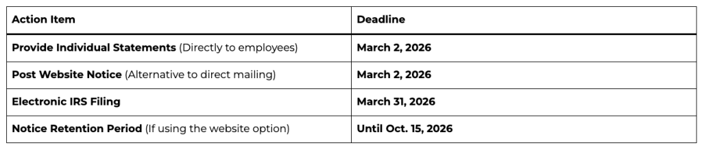 Website Notice Alternative: Instead of mailing every form, you may post a “clear, conspicuous, and easily accessible” notice on your website by March 2, 2026.