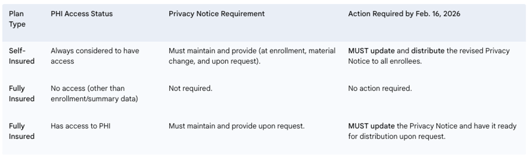 Next Steps for Employers: Employers with self-insured health plans, or fully insured plans that manage PHI, must immediately begin the process of updating their Privacy Notices to incorporate the new requirements for SUD treatment records. It is currently uncertain if HHS will release updated model privacy notices before the deadline.